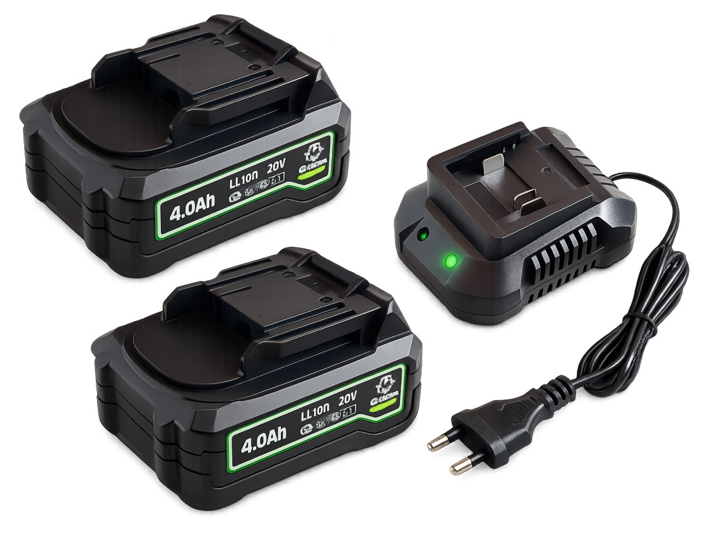 A csomag 2 db 20V 4Ah akkumulátort és 1 db szimpla akkutöltőt tartalmaz.