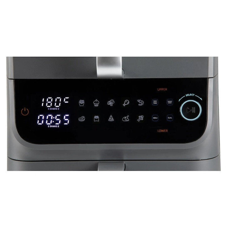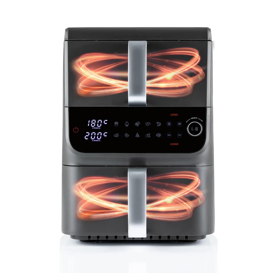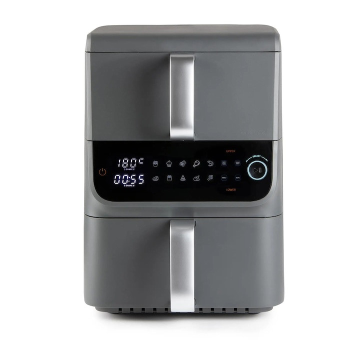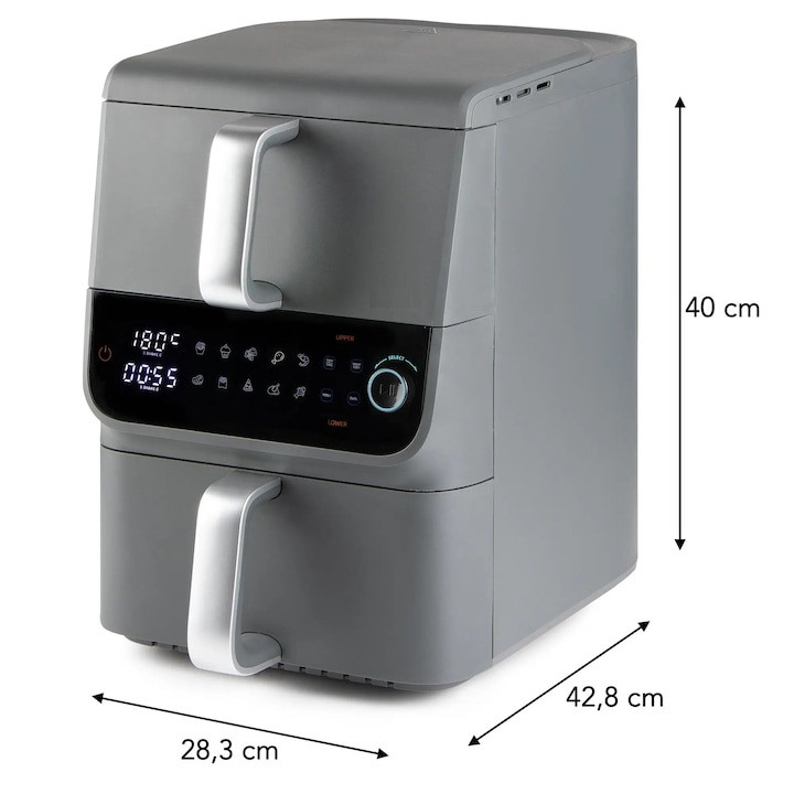 A GourmetMaxx DS16404 dupla kosaras függőleges elrendezésű légkeveréses sütő helytakarékos kialakítást és maximális sokoldalúságot kínál. Két egymás felett helyezett sütőfiókjával helyet takaríthat meg a konyhapulton. 2 különálló sütőkosarának és 10 literes űrtartalmának (3.5 + 6.5 liter) köszönhetően könnyedén készíthet egyszerre két ételt is. Állítsa be a hőmérsékletet (80-200 °C) és az időt (akár 60 perc) külön-külön mindkét fiókhoz, vagy válasszon 10 automatikus program közül. Az intelligens funkciók biztosítják, hogy mindkét fiók egyszerre fejezze be a sütést, vagy igény szerint azonosan működjenek. Minden beállítás egy elegáns LED érintőképernyőn keresztül vezérelhető. A betekintő ablakok, a belső világítás és a PFAS-mentes tapadásmentes bevonat lehetővé teszi a sütés biztonságos és egyszerű ellenőrzését.