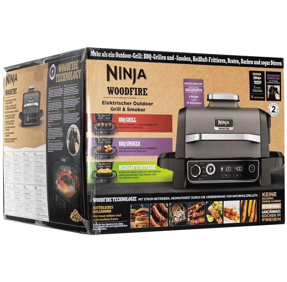 Fedezze fel a szabadtéri sütés új módját a Ninja Woodfire Elektromos BBQ Grill & Füstölővel. Grillezhet, füstölhet, forró levegővel süthet és még sok mást, mindezt 100%-ban valódi, autentikus Woodfire ízekkel.
