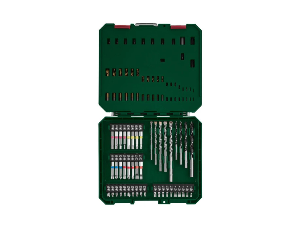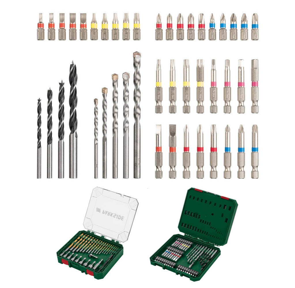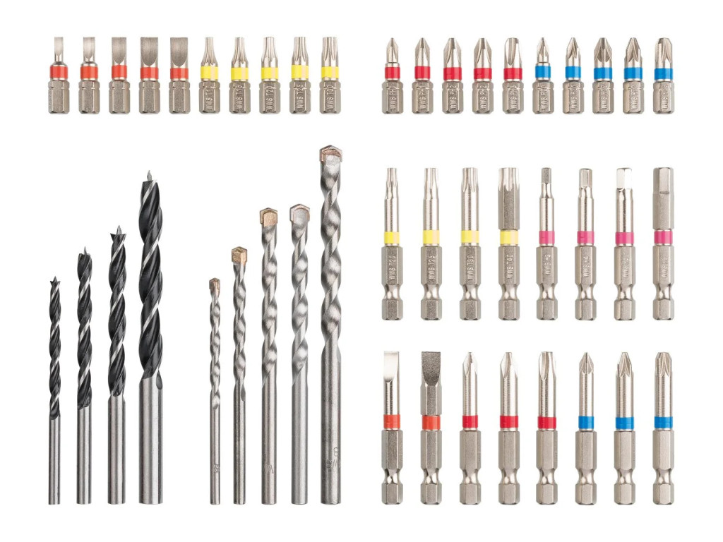- 16 db 50 mm csavarhúzó bit: PH1 / PH2 / PH3 / PZ1 / PZ2 / PZ3 / T20 / T25 / T30 / T40 / SL 1.0 x 5.5 / SL 1.2 x 6.5 / H3 / H4 / H5 / H6