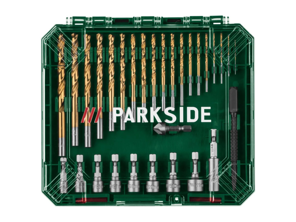 - 20 db 25 mm csavarhúzó bit: PH0 / PH1 / 2 x PH2 / PH3 / PZ0 / PZ1 / 2 x PZ2 / PZ3 / T10 / T15 / T20 / T25 / T30 / SL 0,5 x 3 / SL 0,5 x 4 / SL 0,6 x 5 / SL 1,0 x 6 / SL 1,0 x 6