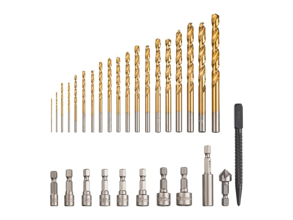 - 19 db fúrószár fémhez: 1 / 1,5 / 2 / 2 / 2,5 / 3 / 3 / 3,5 / 4 / 4,5 / 5 / 5,5 / 6 / 6,5 / 7 / 7,5 / 8 mm