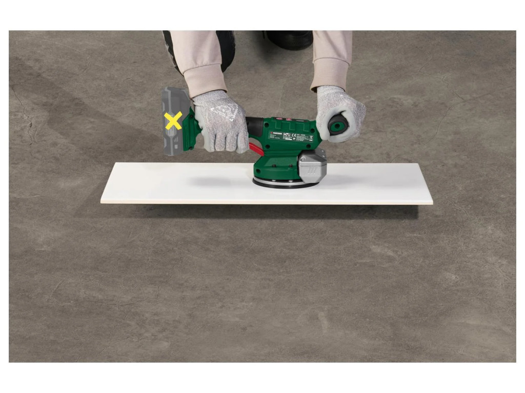 A vibrációs tapadókoronggal nem lehet többet emelni, mint anélkül. Ne becsülje túl az erejét. A szívóhatás erőssége és időtartama a járólap felületétől függ. Az optimális feltételek sima, mázas és tiszta járólapra vonatkoznak. Ügyeljen arra, hogy a tapadókorong mindig tiszta és pormentes legyen. Csak így érhető el az optimális szívóerő. Úgy emelje fel a terhet, hogy egyik keze a markolaton, a másik keze pedig a segédfogantyún legyen.