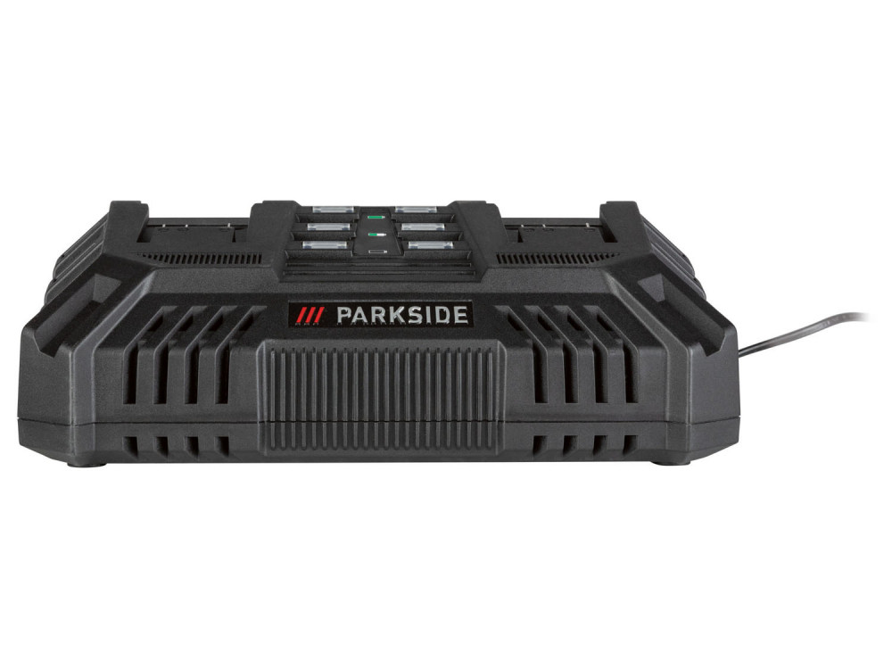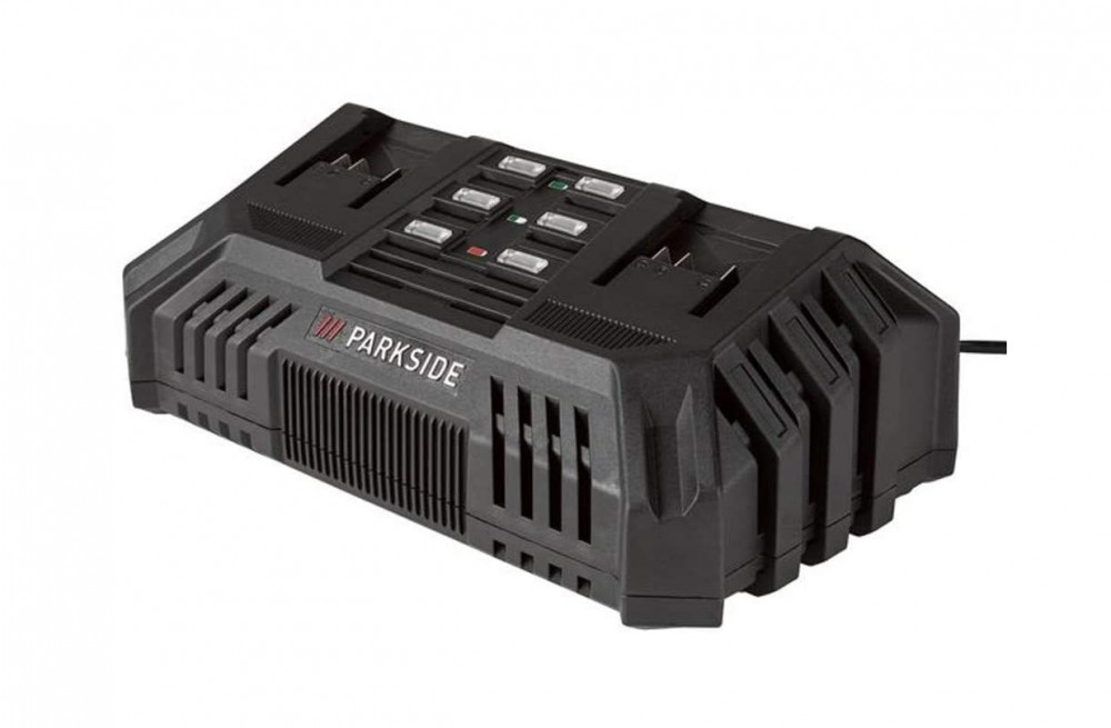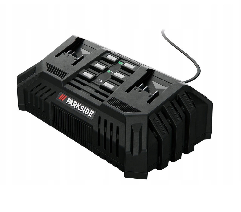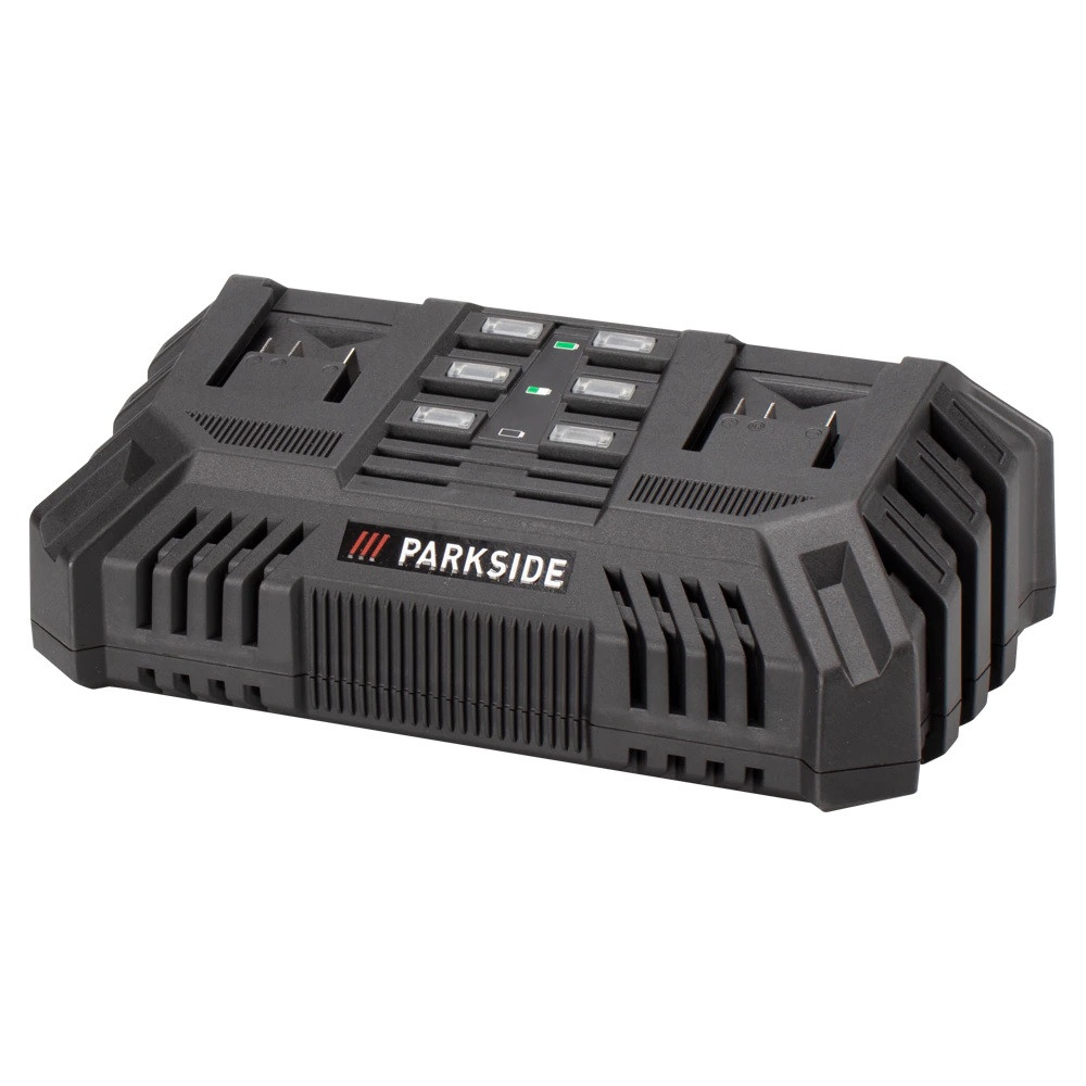 200W 4.5A teljesítményű dupla akkutöltő készülék, ParkSide X20V Team akkucsalád tagjaihoz (akkumulátor nélkül).