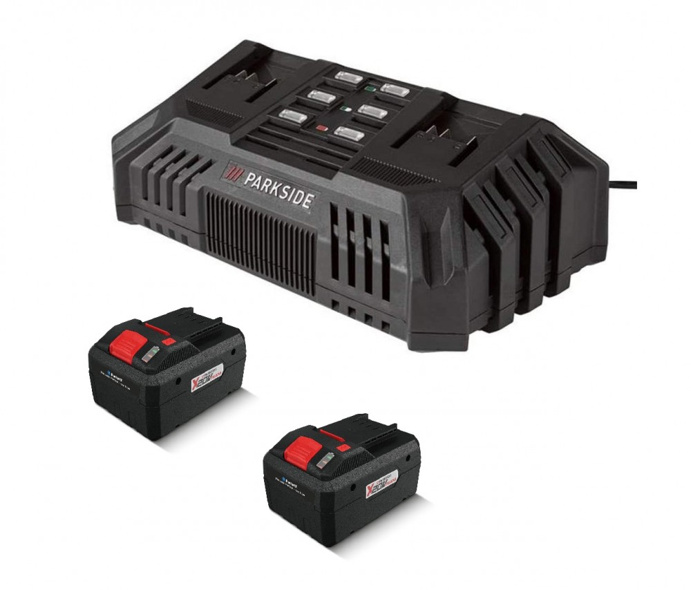 200W 4.5A teljesítményű dupla akkutöltő készülék, ParkSide X20V Team akkucsalád tagjaihoz (akkumulátor nélkül).