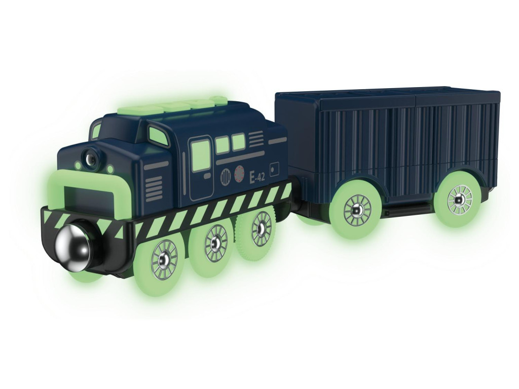 GLOW önjáró, elemes, sötétben világító tehermozdony vagonnal: