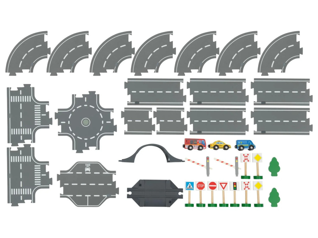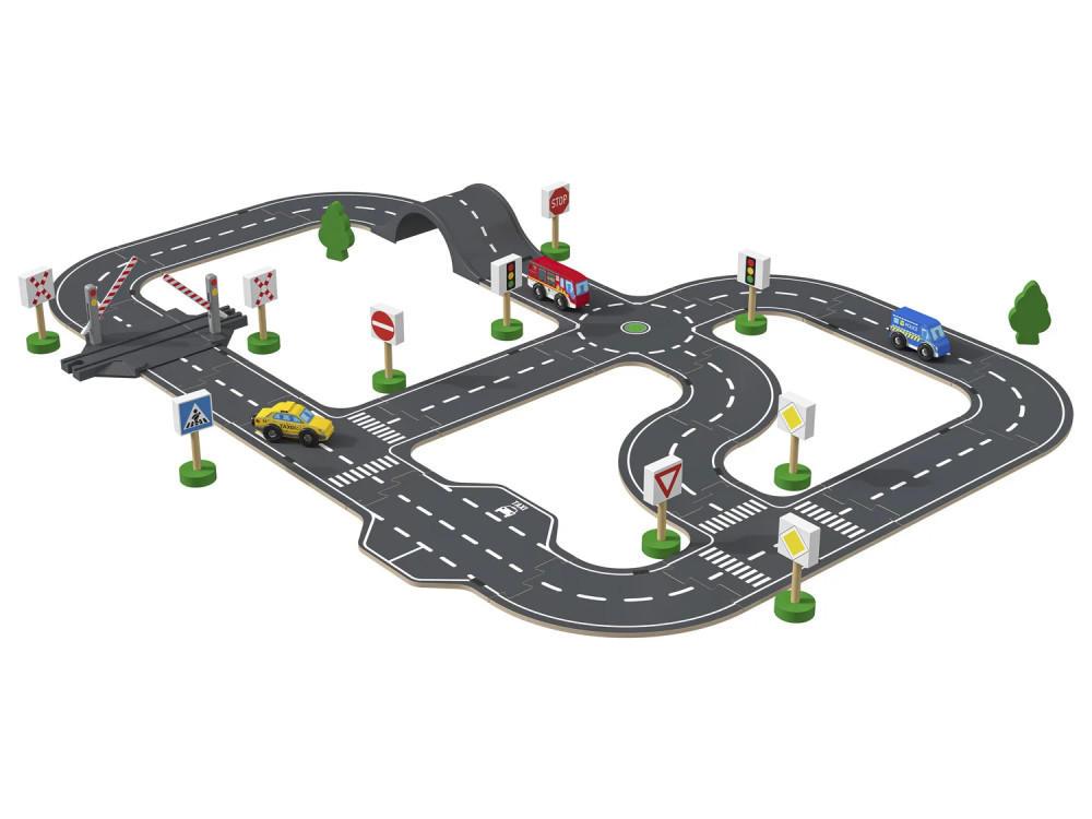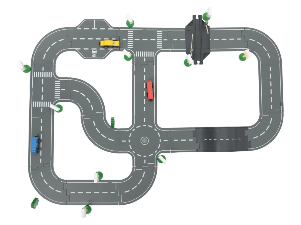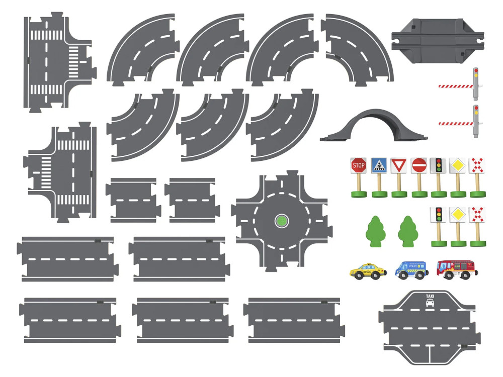 - Számos tartozék: 3 jármű (taxi, tűzoltó és rendőr), 8 közlekedési tábla és 2 közlekedési lámpa