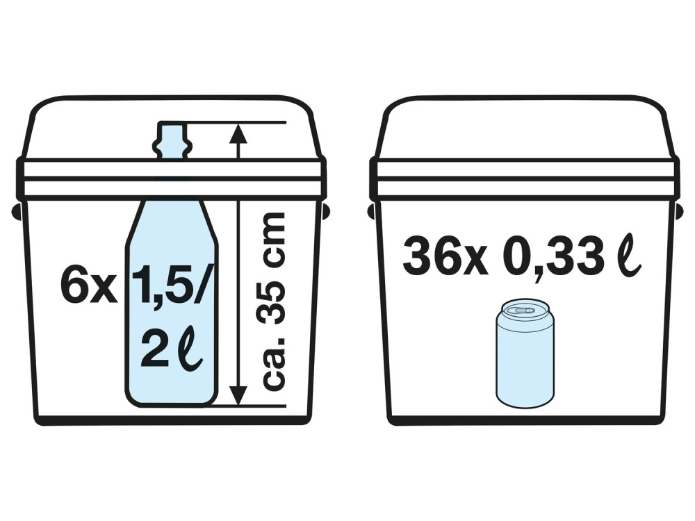 - 6 db 1,5 literes palack, vagy 1 db 2 literes + 5 db 1,5 literes palack tárolható benne állítva, továbbá 36 db 0,33 l-es dobozos üdítőhöz elegendő kapacitású