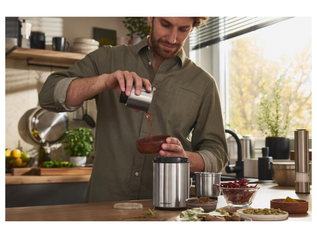 Az őrlőtartály egy 2-pengés aprítókéssel van felszerelve, ami keményebb és száraz élelmiszerek, például szemes kávé, rozs, árpa, közepesen durva tengeri só, bors vagy mustármag őrlésére/zúzására alkalmas.