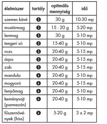 Az alábbi táblázatban szereplő mennyiségek és időtartamok tájékoztató jellegűek. Az értékek az optimális feldolgozási mennyiségre vonatkoznak; a végeredmény függ többek között a feldolgozandó élelmiszer frissességétől, minőségétől és mennyiségétől, valamint az Ön személyes ízlésétől.