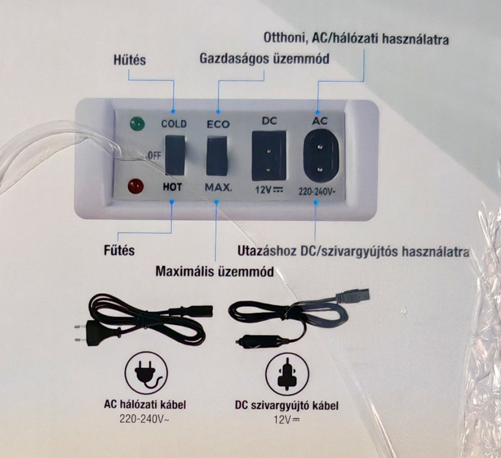 - Hűtési teljesítmény: AC 230V-ról üzemeltetve 60W, DC 12V-ról: 50W