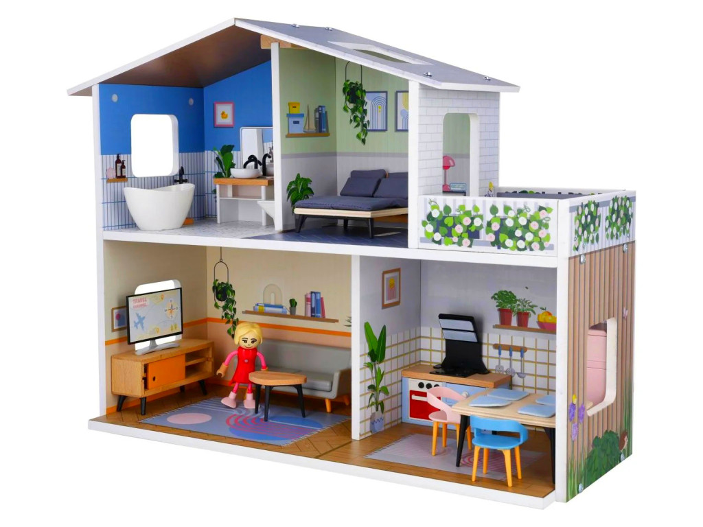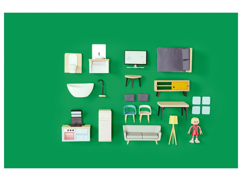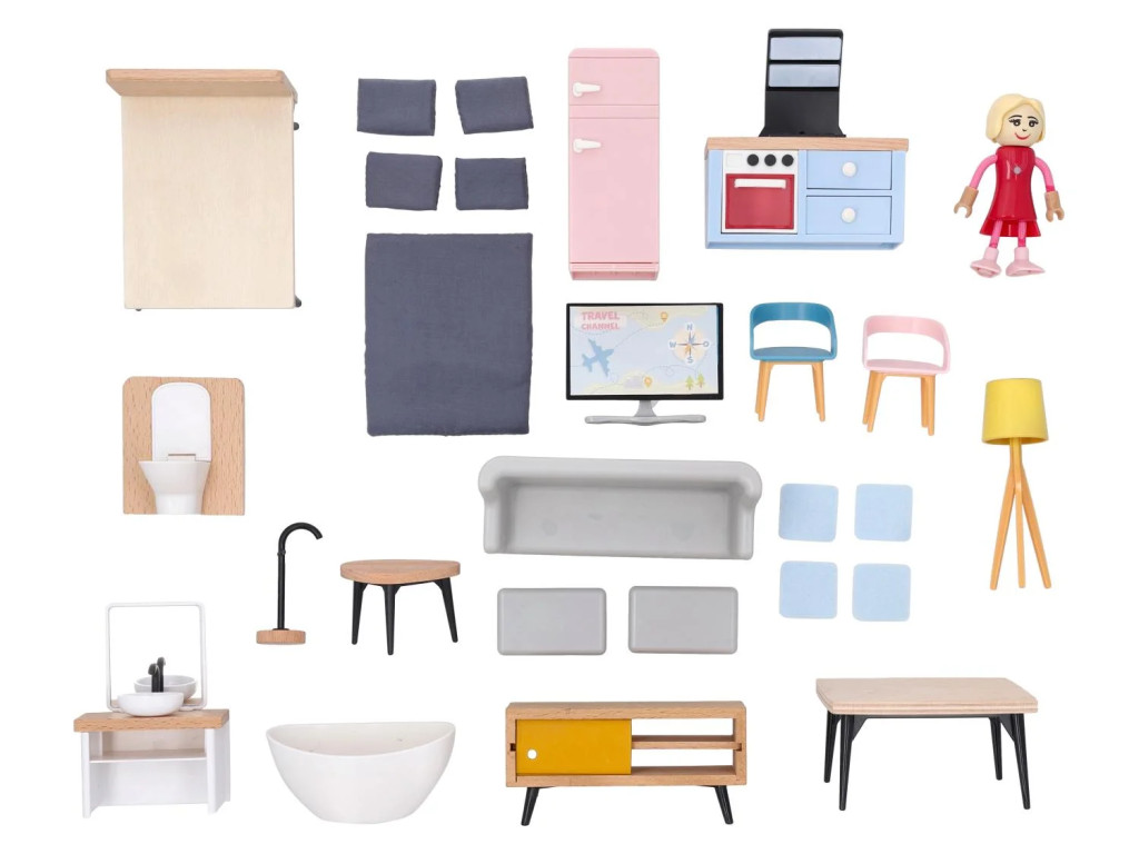 - Nyitott oldal, fürdőszoba, hálószoba, nappali és konyha